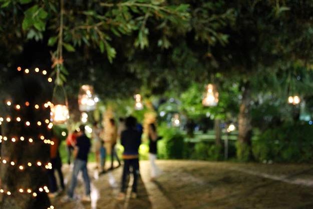 Ci siamo subito innamorati dell’enorme quercia al centro del patio, facendone il cuore del nostro allestimento. L’abbiamo vestita con candele e lucciole natalizie, mentre preparavamo a festa il prato tutt’intorno.