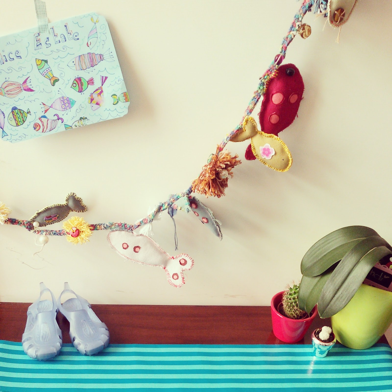 Adoro questa ghirlanda: è piena di pescetti colorati, perline, pom pon e fili intrecciati che tanto mi ricordano un fondale marino.