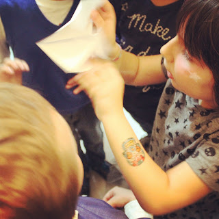 Per gli invitati, grandi e piccini, abbiamo pensato a una vera e propria trasformazione in chiave rock: fasce colorate per i capelli, spalline imbottite (moolto anni 80!), trucchi esagerati e tanti tantissimi tatuaggi. Il tutto da fornire in un vero e proprio camerino… da star!