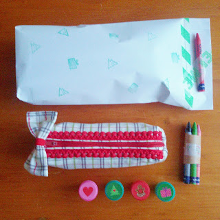 Ho pensato ad una confezione regalo che potesse tenerli occupati per un pò. Alle mie amiche, entrambe insegnanti, ho regalato un astuccio colorato. L’ho riempito di pastelli a cera, poi ho chiuso il tutto in un semplice foglio bianco, prima decorato con timbrini natalizi. A chiudere il pacco un solo pastello, che ha attirato da subito i piccoli discoli. E così, mentre noi gioivamo dei nostri pensierini, loro sono partiti in una gara di scarabocchi colorati, con carte stracciate e colori dappertutto.